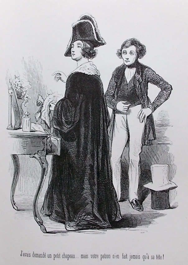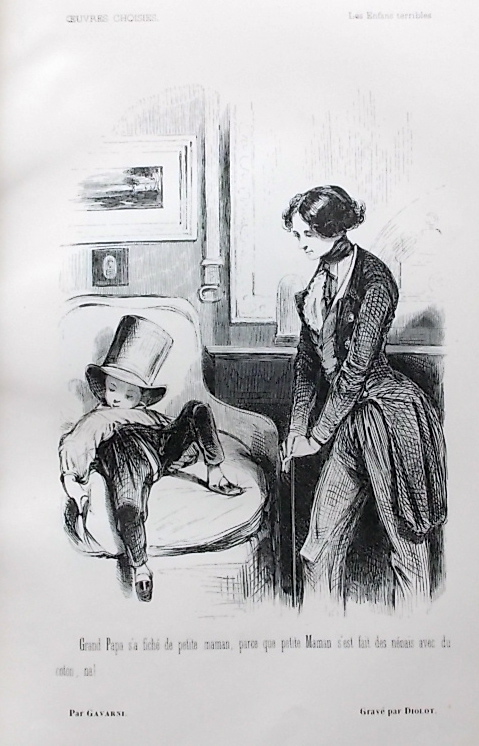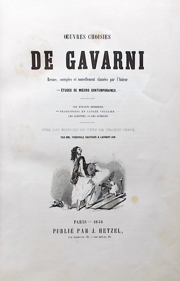 Trois volumes sur quatre. Un dernier tome paraitra une année plus tard en co-édition avec Garnier. Premier tirage sur bois des travaux de Gavarni. En effet, l’artiste a choisi et dessiné de nouveau 320 de ses lithographies du Charivari pour les adapter à la gravure sur bois. Les suites se composent ainsi (conforme à Carteret III, 260-62) : 1° série : Les Enfants terribles : 39 planches – Traductions en langue vulgaire : 5 planches – Les Lorettes : 25 planches – Les Actrices : 11 planches – 2° série : Fourberies de femmes en matière de sentiment : 48 planches – Clichy : 19 planches – Paris le soir : 13 planches – 3° série : Le Carnaval à Paris : 23 planches – Paris le matin : 10 planches – Les étudiants de Paris : 47 planches. Soit un total de 240 planches. Chaque série est précédée d’une notice par Th. Gautier, Gorlan, Auguste Lireux, Laurant-Jan, etc… (Vicaire III, 953-55). Bien complet du frontispice pour la 1° série (Gavarni vu de dos). Ex-libris sur premier contreplat. Bel exemplaire.