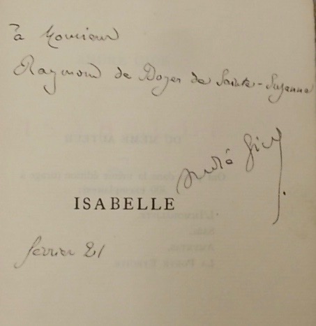 Un des 500 exemplaires sur vergé d’Arches filigrané. Exemplaire enrichi d’un envoi autographe signé de Gide (daté de février 21) en page de faux-titre. Très bel exemplaire.