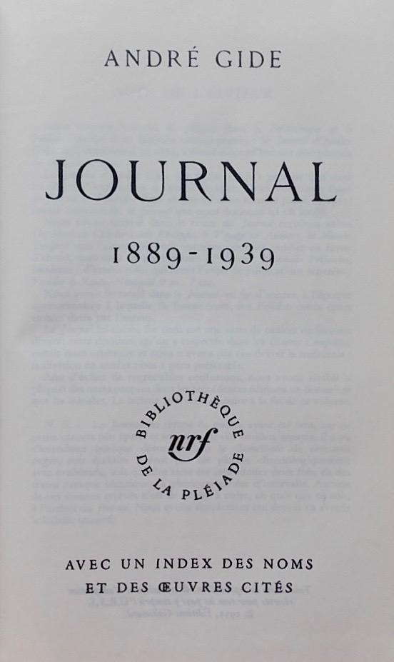 GIDE (André) Journal (1889-1939). Paris, Gallimard (coll. Bibliothèque de la Pléiade), 1965.