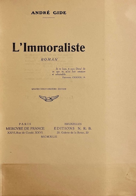 GIDE (André) L’immoraliste. Paris, Mercure de France & Bruxelles, Editions N. R. B., 1942.