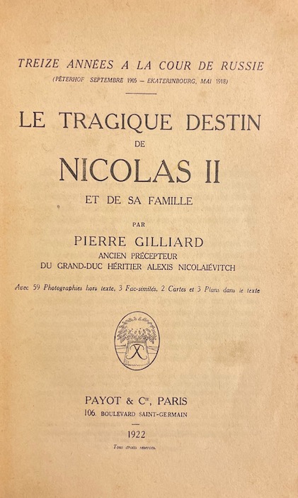 GILLIARD (Pierre) Le tragique destin de Nicolas II et de sa famille. Treize années à la cour de Russie. Paris, Payot & Cie, 1922.