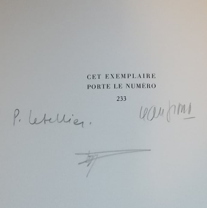 Edition originale tirée en tout à 295 exemplaires (celui-ci un des 185 exemplaires numérotés sur pur vélin d’Arches filigrané). Illustré de 16 lithographies originales en couleurs de Pierre Letellier tirées par Fernand Mourlot. Signé par l’auteur, par l’artiste et par l’éditeur à la justification. petites rayures à l’étui-boîte, sinon à l’état de neuf.