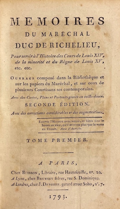 ![[GIRAUD SOULAVIE (Jean Louis)] Memoires du Maréchal Duc de Richelieu, pour servir à l'Histoire des Cours de Louis XIV, de la minorité et du Règne de Louis XV, etc. etc. A Paris, Lyon et Londres, chez Buisson, Bruyset Frères et Deboffe, 1793. – Image 5](https://cabinetamateur.ch/wp-content/uploads/2025/11/39872_5.jpg)