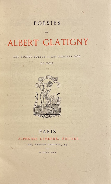 GLATIGNY (Albert) Poésies. Les vignes folles – Les flèches d’or – Le bois. Paris, Alphonse Lemerre, 1869.