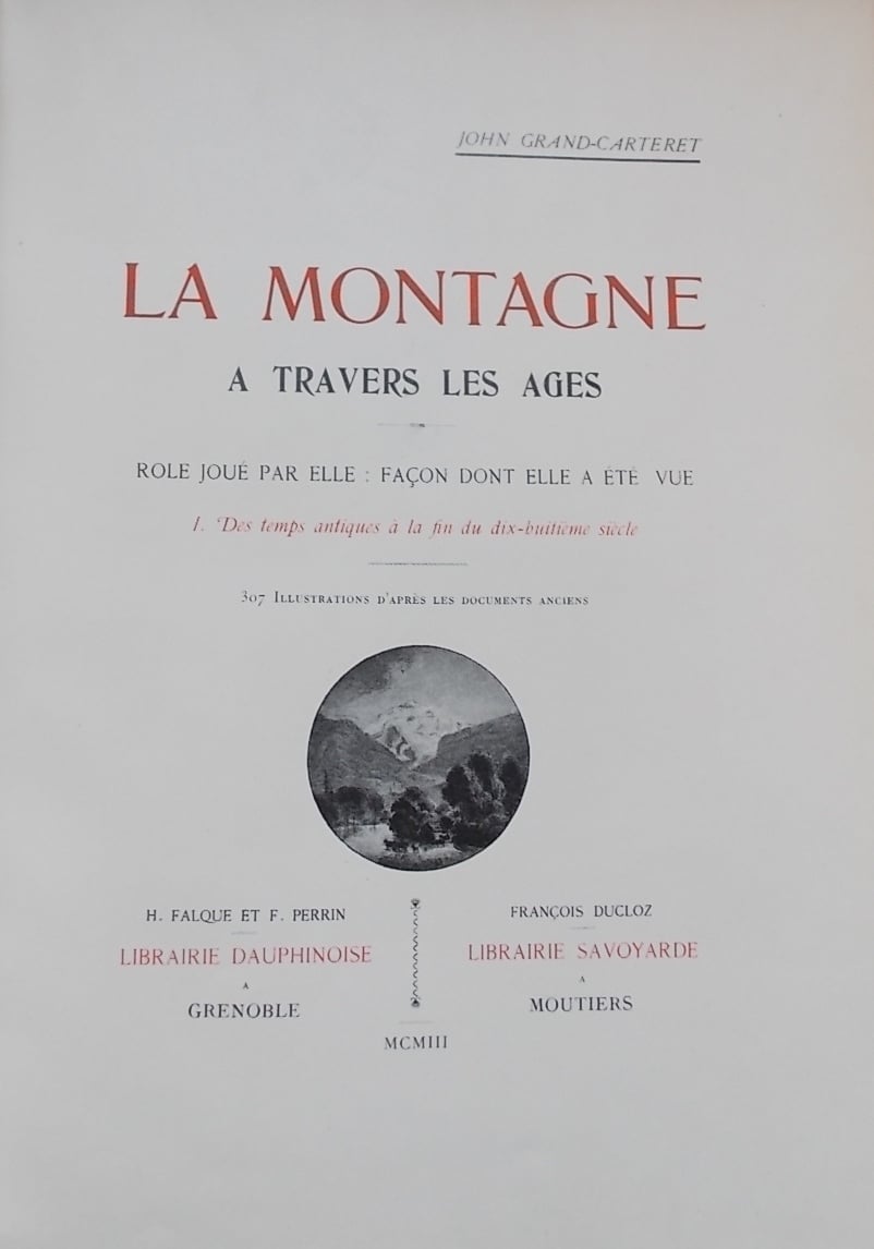 GRAND-CARTERET (John) La montagne à travers les âges. Rôle joué par elle, façon dont elle a été vue. Tome 1: Des temps antiques à la fin du XVIIIe siècle. Tome 2: La Montagne d’aujourd’hui. Grenoble, H. Falque et F. Perrin – Librairie Dauphinoise & Moutier, F. Ducloz – Librairie Savoyarde, 1903-1904.