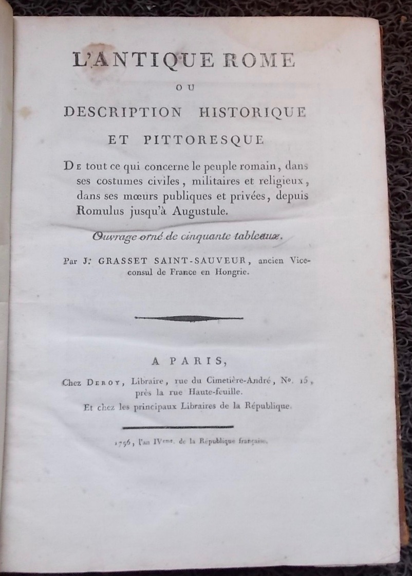 GRASSET DE SAINT-SAUVEUR (J.) L’antique Rome, ou description historique et pittoresque de tout ce qui concerne le peuple romain, dans ses costumes civiles, militaires et religieux, dans ses moeurs publiques et privées, depuis Romulus jusqu’à Augustule. A Paris, chez Deroy, 1796.