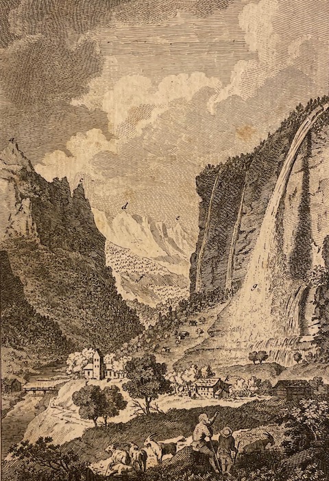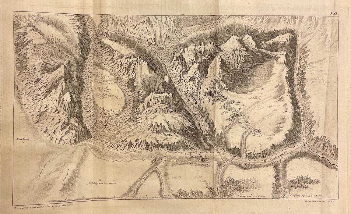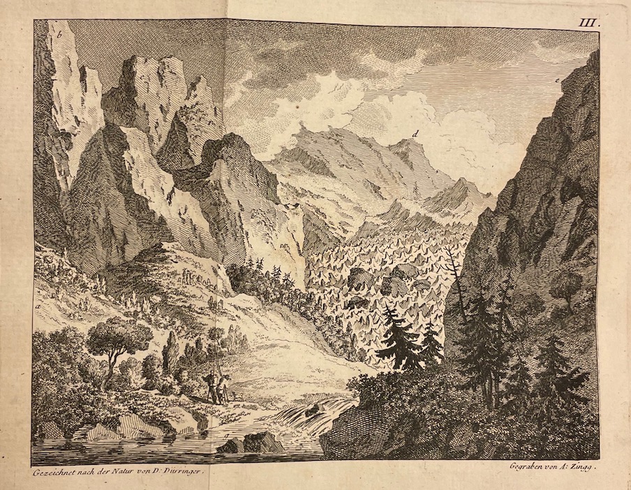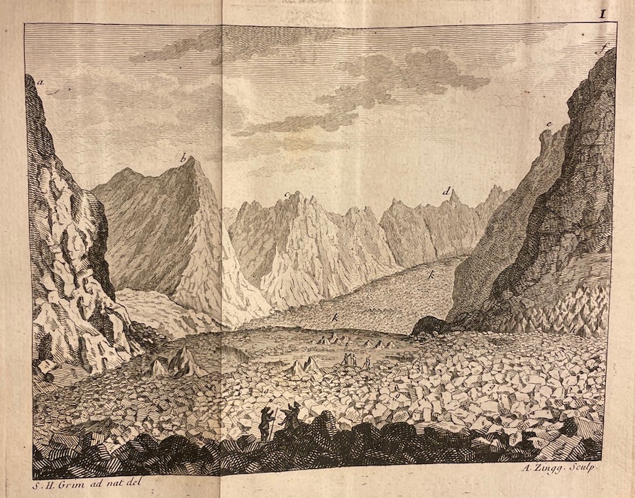 Première édition de la traduction française de Die Eisgebirge des Schweizerlandes de Gottlieb Sigmund Gruner (1717-1778), géographe et naturaliste de Berne, avec retirage des gravures en taille-douce de l’Édition originale suisse (Berne, 1760), soit : le frontispice  dessiné d’après nature  par J.L. Alberti ; 18 planches dépliantes d’après S. H. Grim, Meyer, von Hubert, A. Herbord, J. H. Koch, D. Durringer, G. Walser et Zingg, figurant des vues des Alpes suisses et des glaciers du Mont Blanc, toutes gravées par A. Zingg ; et 2 cartes non signées avec indication des ressources minérales des glaciers suisses. L’édition française comprend de surcroît un tableau d’explication des mots allemands et des signes employés dans les cartes. Parmi les illustrations figure la plus ancienne vue panoramique du Mont-Blanc (planche 13,  Elle représente l’amas Faucigny ).