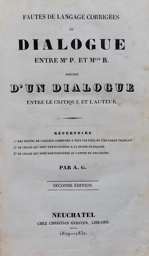 GUILLEBERT (Alphonse) Fautes de langage corrigées ou Dialogue entre Mr. P. et Mlle R., précédé d’un dialogue entre le critique et l’auteur. Neuchâtel, Christian Gerster, 1829-1832.