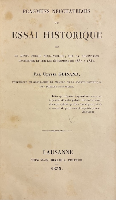 GUINAND (Ulysse) Fragments neuchâtelois, ou Essai historique sur le droit public neuchâtelois, sur la domination prussienne et sur les événemens de 1830 à 1832. Lausanne, chez Marc Ducloux, 1833.