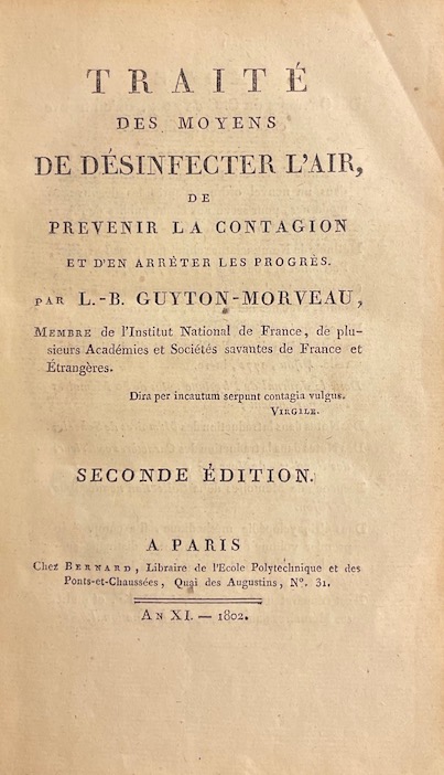 GUYTON-MORVEAU (L. B.) Traité des moyens de désinfecter l’air, de prévenir la contagion, et d’en arrêter les progrès. Paris, Bernard, An XI-1802.