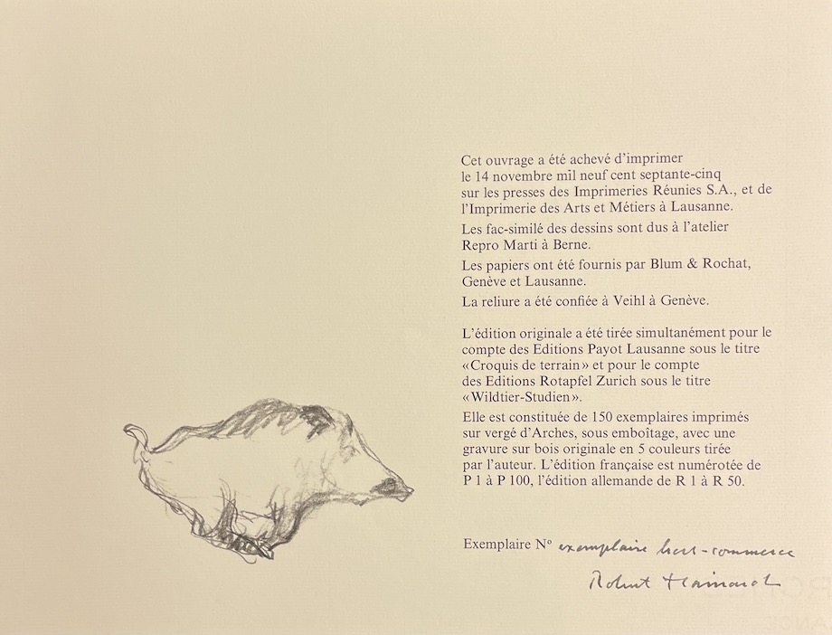 Edition originale. Exemplaire hors commerce imrpimé sur vergé d’Arches justifié et signé par Robert Hainard (comme les 100 exemplaires de tête mais sans la gravure en couleurs originale). Rassemble 50 croquis reproduits à pleine page. En excellente condition.