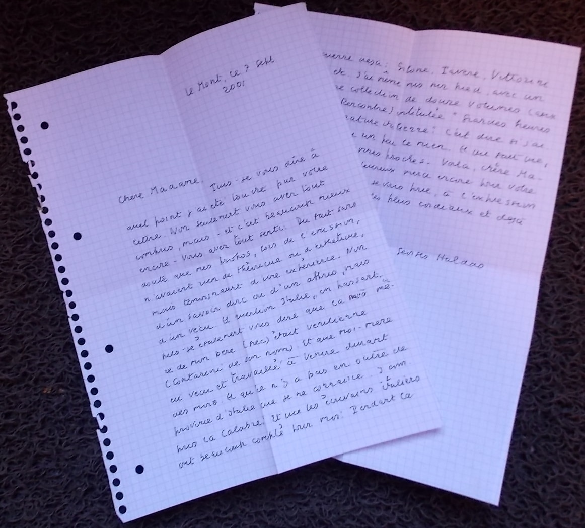 Exemplaire enrichi d’un envoi autographe signé de l’auteur, daté de novembre 2001, à Constance Pasquali (traductrice notamment de Mario Praz). Mais surtout, ce volume est accompagné de 2 lettres autographes signées de Haldas, écrites sur des pages de papier quadrillé retirées de cahiers à anneaux. La première – datée du 7 septembre 2001 – est une réponse à une lettre écrite par Madame Pasquali suite à une émission de télévision ou de radio, dans laquelle Haldas a évoqué l’Italie. Dans la seconde lettre, datée du 2 octobre 2001, Haldas suggère à sa correspondante de prendre contact avec lui par téléphone pour agender une rencontre. On peut en déduire que cette rencontre eut lieu en novembre 2001 et que Haldas lui offrit cet exemplaire de La maison de Calabre à cette occasion . L’ensemble