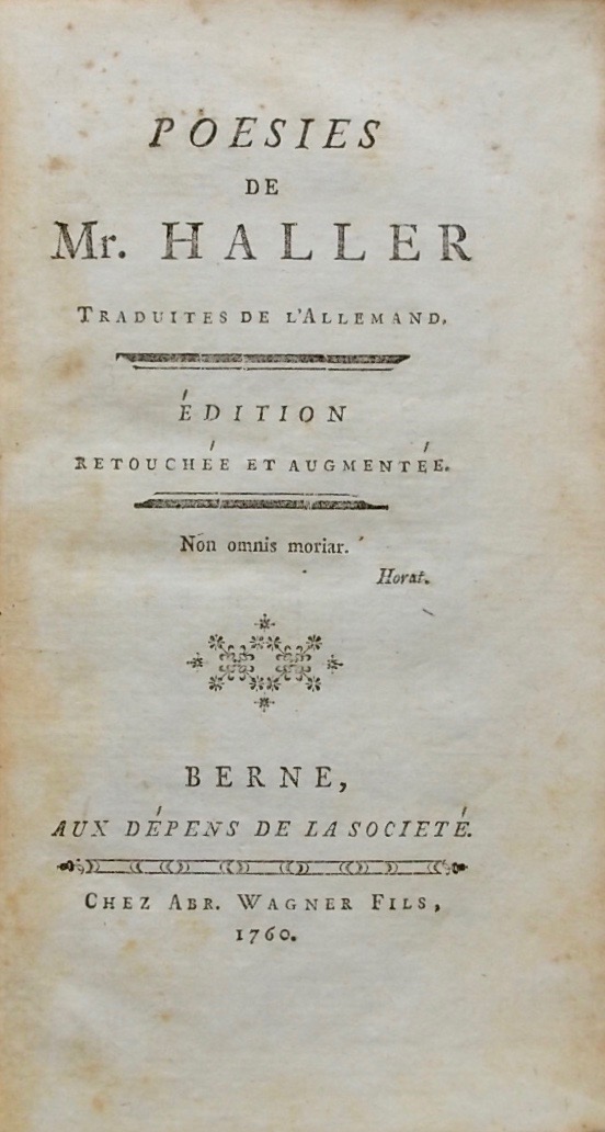 ![HALLER (Albrecht von) Poésies de Mr. Haller. Edition retouchée et augmentée. [suivi de] Seconde partie. Ou traductions, qui peuvent servir de suite aux Poésies de Mr. Haller. Berne, Aux dépens de la Société - Chez Abr. Wagner Fils, 1760.](https://cabinetamateur.ch/wp-content/uploads/2025/10/35998_1.jpg)