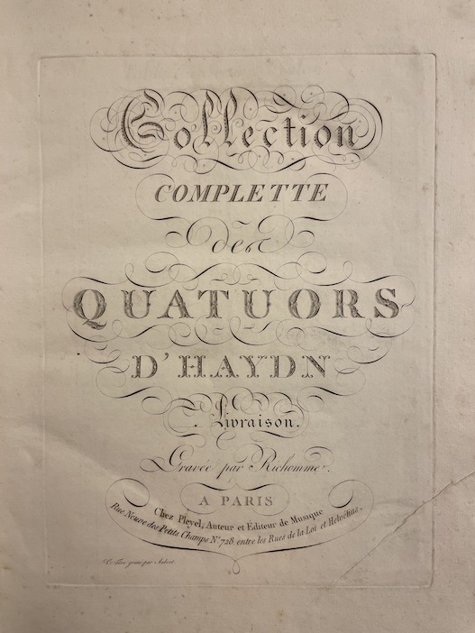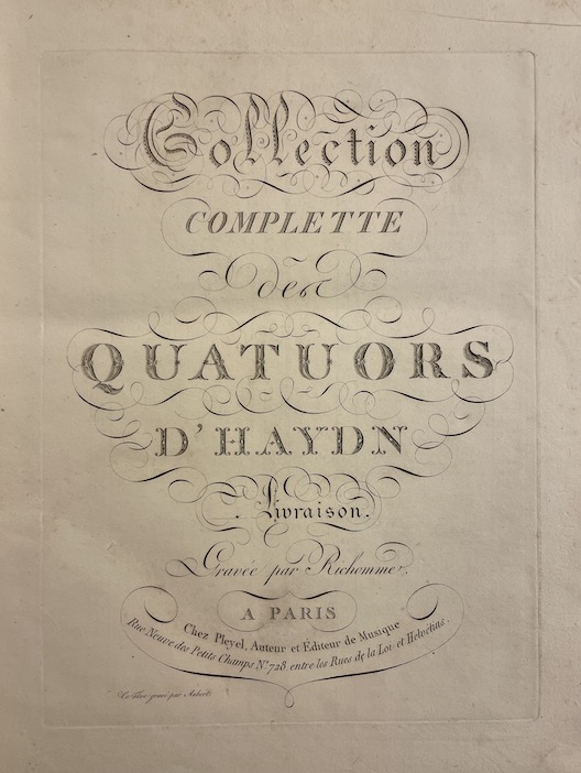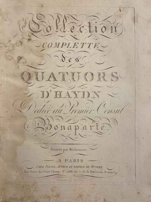 La première édition (de la plus grande rareté évidemment) de l’intégrale des quatuors à cordes de Haydn publiée en 1802 par Pleyel et connue sous le nom de « Bonaparte Edition ».