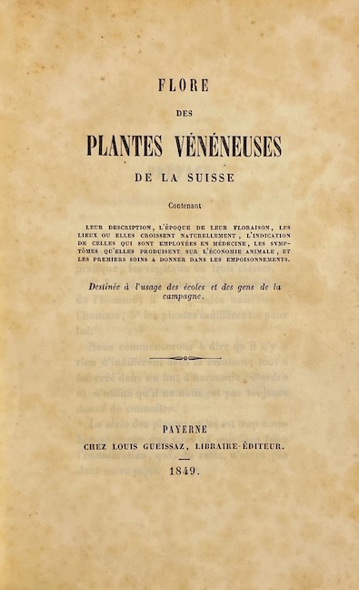 [HEGETSCHWEILER (Johannes)] Flore des plantes vénéneuses de la Suisse. Contenant leur description, l’époque de leur floraison, les lieux ou elles croissent naturellement, l’indication de celles qui sont employées en médecine, les symptômes qu’elles produisent sur l’économie animale, et les premiers soins à donner dans les empoisonnements. Payerne, Louis Gueissaz, 1849.