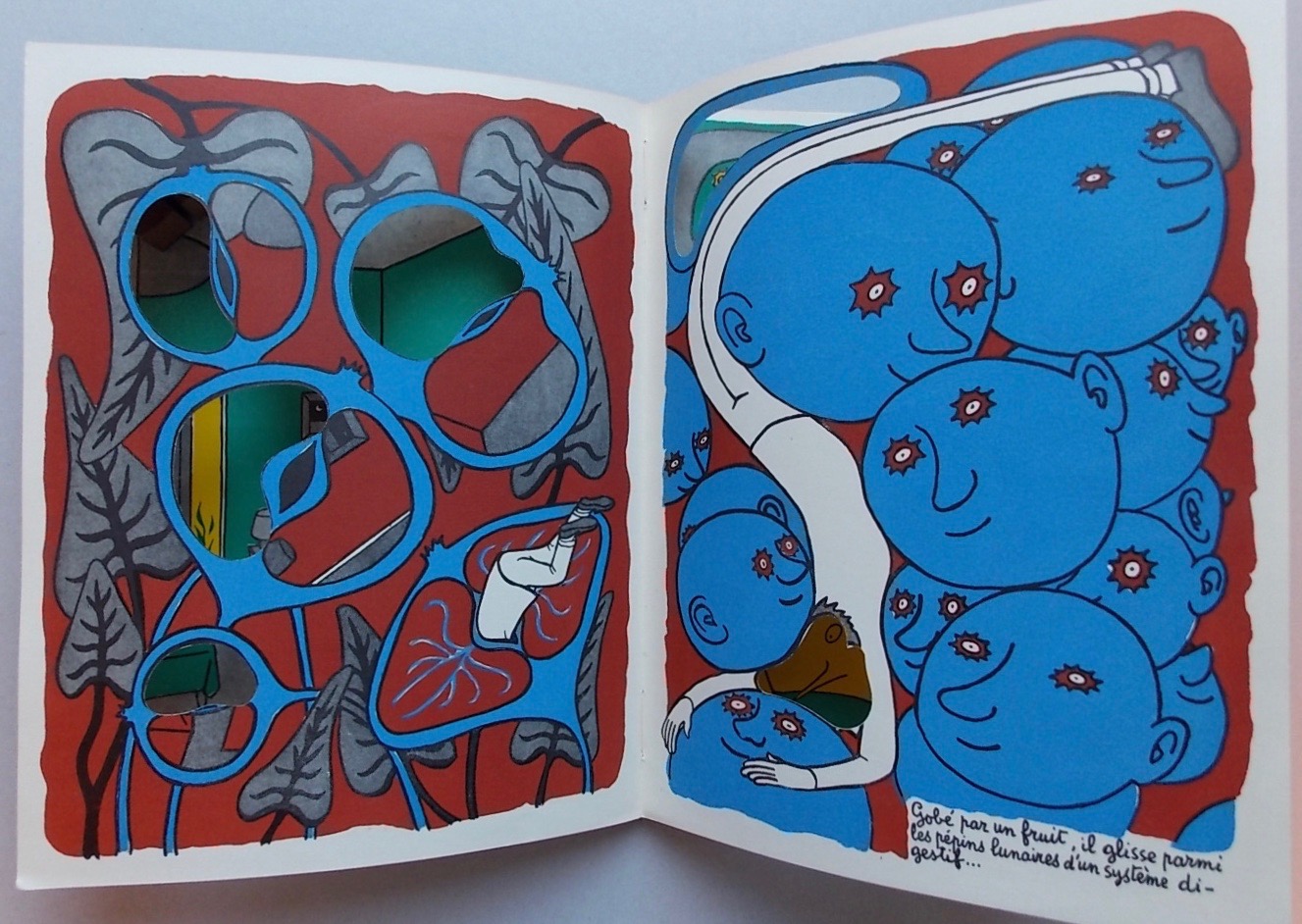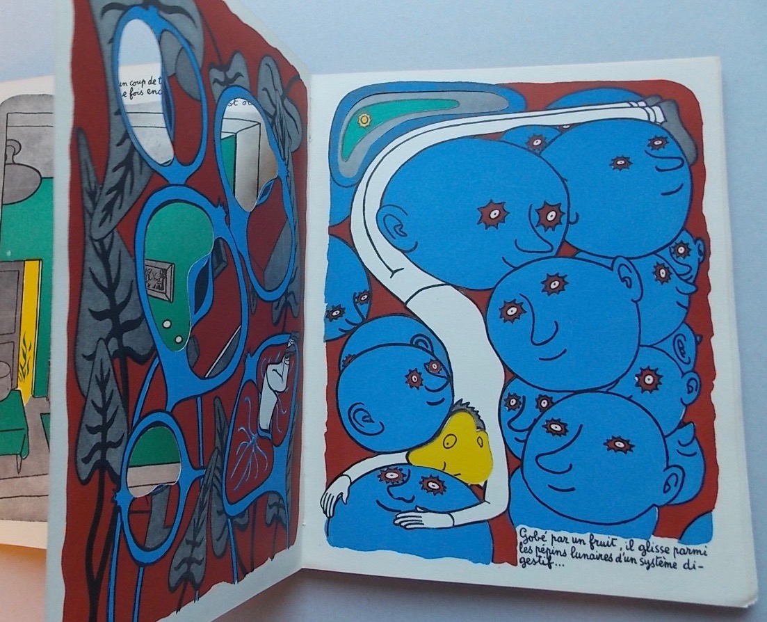 Célèbre album à transformations qui coûta une fortune à l’éditeur en raison de ses difficultés de fabrication. Le texte et les dessins de Maurice Henry sont reproduits en couleurs, un habile système de découpage permettant une lecture double, sur les pages de gauche et de droite, de ce conte surréaliste dont la trame est un rêve. Exemplaire avec le cartonnage non ajouré et illustré en bleu. En excellente condition.