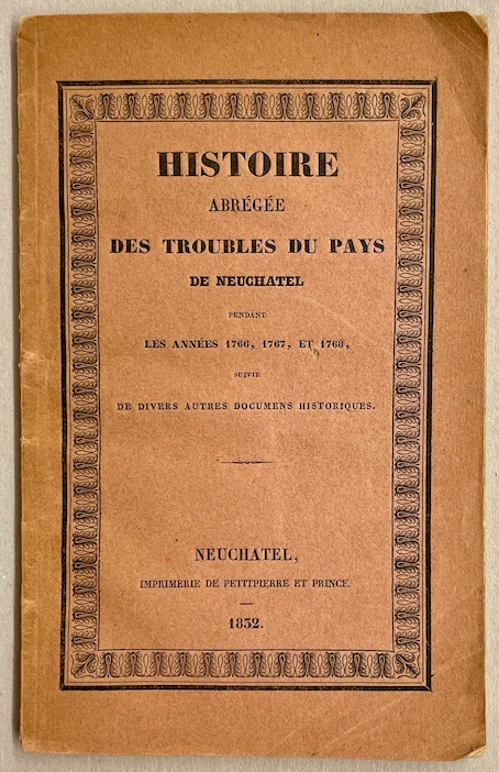 *** Histoire abrégée des troubles du Pays de Neuchâtel pendant les années 1766, 1767, et 1768, suivie de dibvers autres documents. Neuchâtel, Imprimerie de Petitpierre et Prince, 1832.