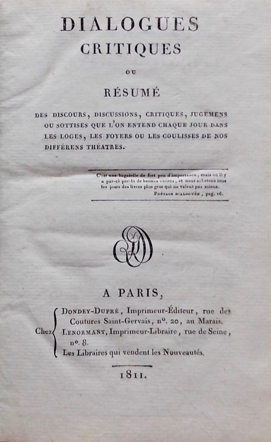 ![[HOFFMANN (François Benoît)] Dialogues critiques, ou Résumé des discours, discussions, critiques, jugemens ou sottises que l'on entend chaque jour dans les loges, les foyers ou les coulisses de nos différents théâtres. A Paris, Dondey-Dupré, 1811. – Image 3](https://cabinetamateur.ch/wp-content/uploads/2025/11/36953_3.jpg)