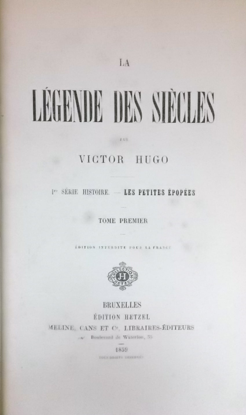 HUGO (Victor) La Légende des siècles. Première série: Les petites épopées. Bruxelles, Editions Hetzel – Meline, Cans et Cie, 1859.