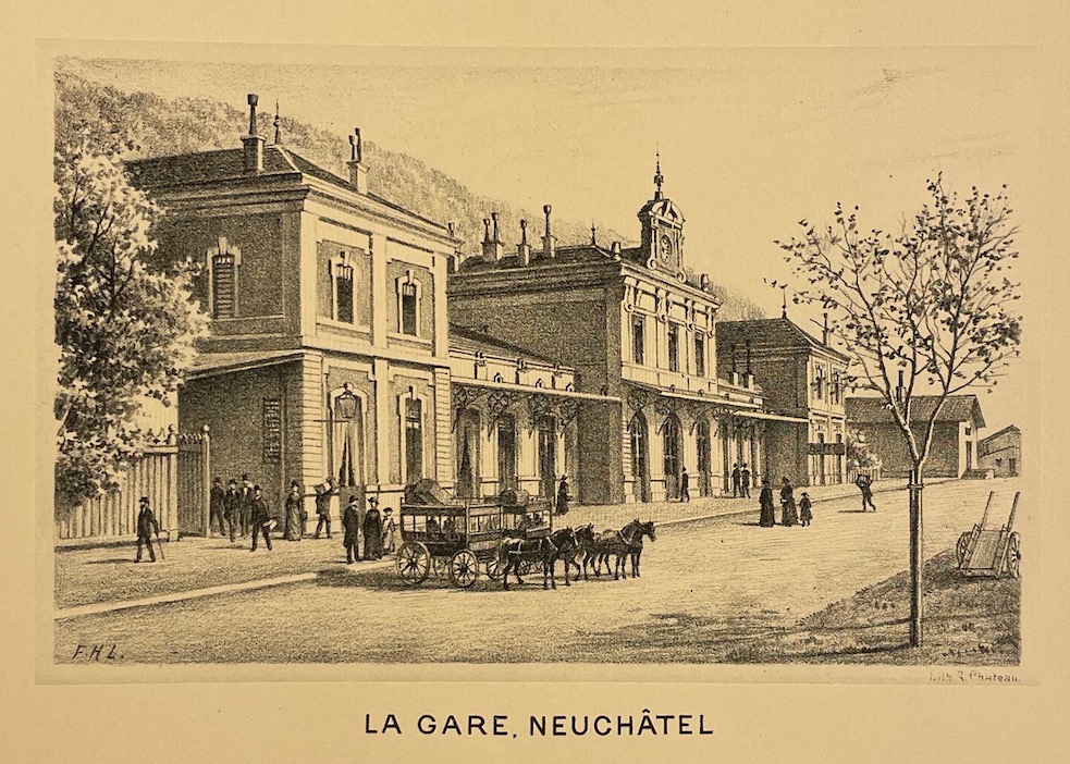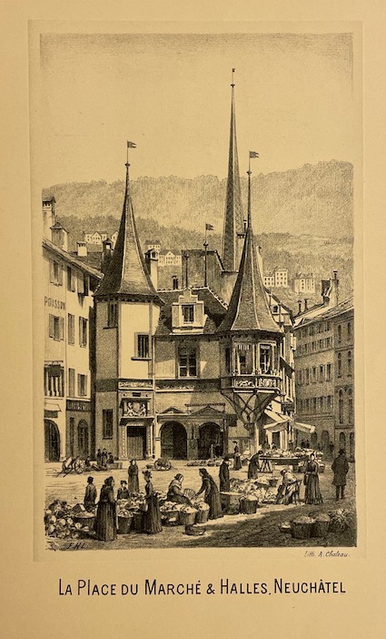Première série seule, comprenant 47 lithographies – dont 4 panoramas en double-page – sur 48 (manque le n° 35 La Place du Marché du Locle) dessinées d’après nature par F. Huguenin-Lassauguette. Avec les 6 feuillets de légendes qui manquent la plupart du temps. [BN 44]