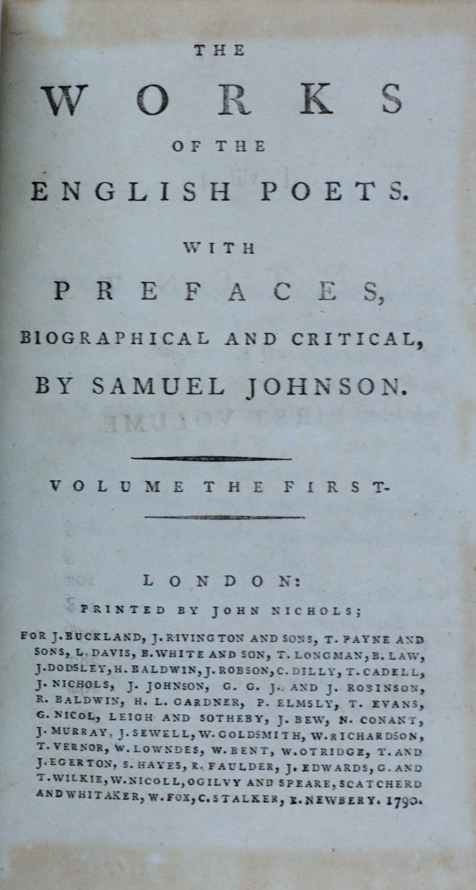JOHNSON (Samuel) The Works of the English Poets. With Prefaces, Biographical and Critical Observations London, Printed by John Nichols for J. Buckland, J. Rivington and sons…, 1790.
