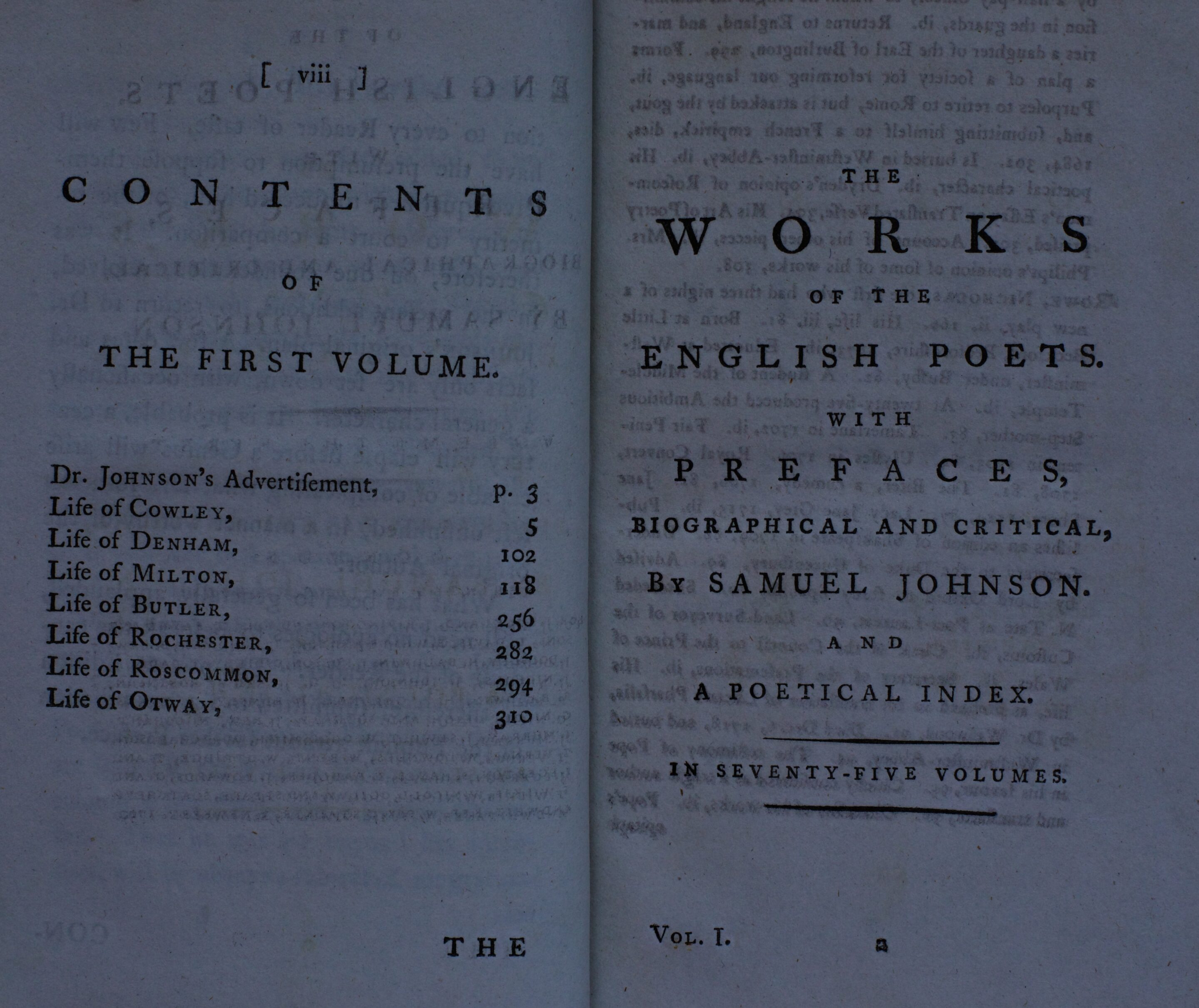 Un recueil de biographies par Samuel Johnson consacré aux poètes anglais les plus importants, contenant des sélections d’œuvres les plus populaires pour chacun. Cet ouvrage est une vaste collection de courtes biographies et d’évaluations critiques. Les six premiers volumes se nomment ‘Lives’, les soixante-sept suivants contiennent les poèmes des auteurs cités dans ‘Lives’, dont Milton, Dryden, Gay, Butler, Swift, Pope… Les volumes 74 et 75 sont des volumes d’index.