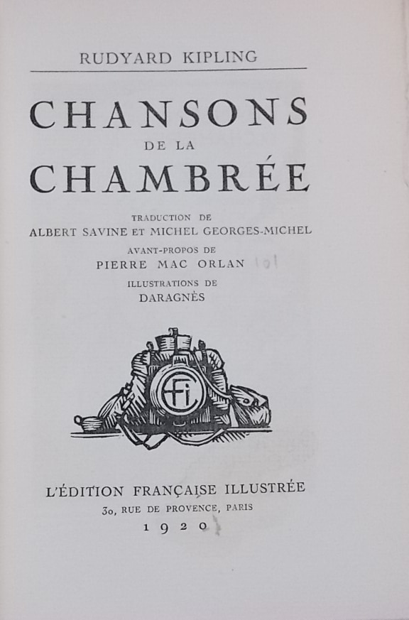 KIPLING (Rudyard) Chansons de la chambrée. Paris, L’Edition Française Illustrée, 1920.