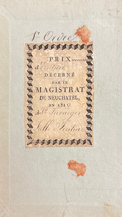 Traduction nouvelle & seule complète de l’original allemand de Klopstock, par feu M. Louis-Frédéric Petitpierre, Pasteur à Neuchâtel. Avec sur le second plat du premier volume, une étiquette collée: Livre de Prix décerné par le Magistrat de Neuchâtel en 1819…. et les armes de la ville de Neuchâtel frappées sur le premier plat. Menus défauts aux reliures.