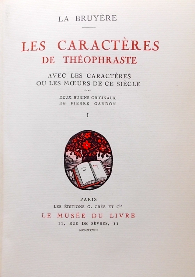LA BRUYERE (Jean de) Les caractères de Théophraste, avec les caractères ou les moeurs de ce siècle. Paris, Crès & Cie (coll. Le Musée du Livre), 1928.