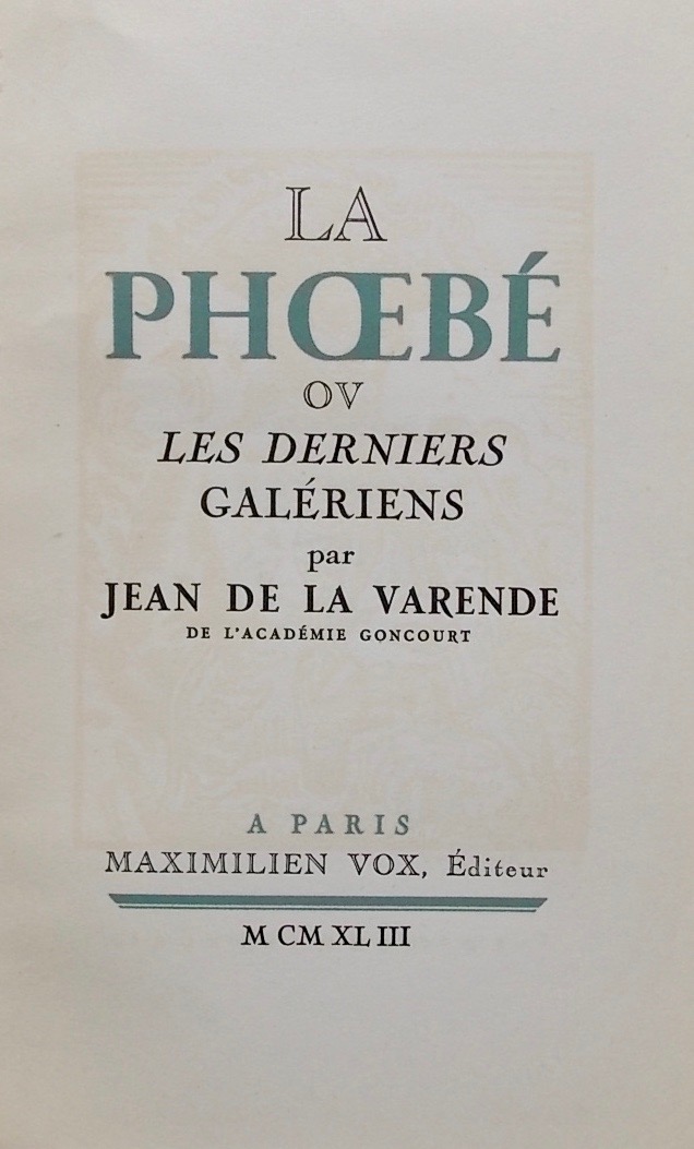 LA VARENDE (Jean de) La Phoebé, ou les derniers galériens. Paris, Maximilien Vox Editeur, 1943.