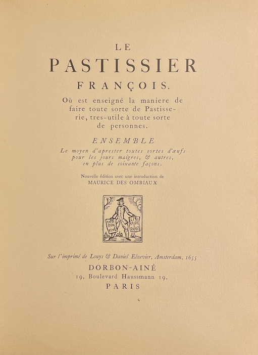 [LA VARENNE (F. P. de)] Le Pâtissier françois. […] Paris, Dorbon-Ainé, 1931.