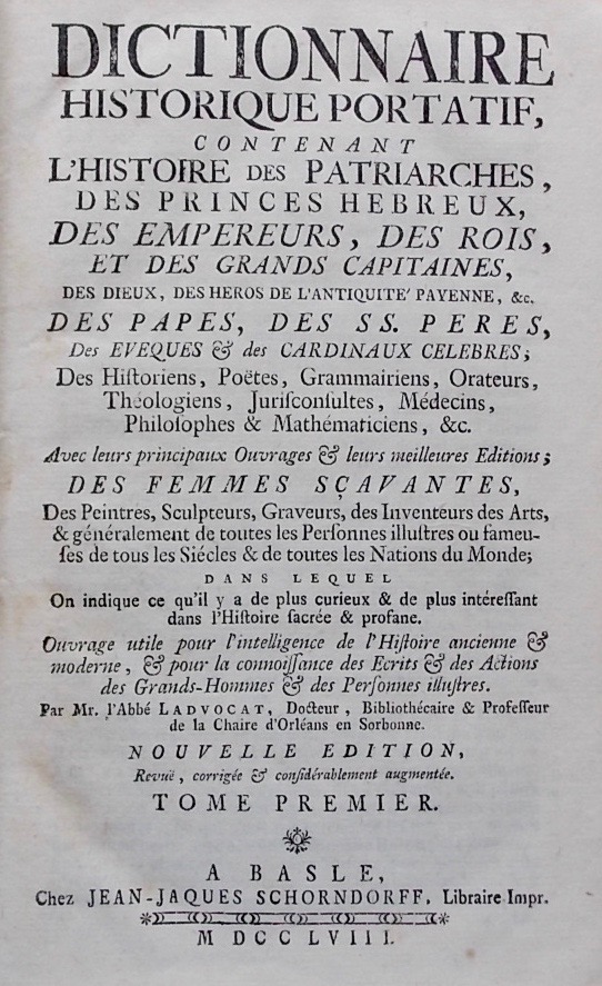 ![LADVOCAT (Jean-Baptiste) Dictionnaire historique portatif, contenant l'histoire des patriarches, des princes hébreux, des empereurs, des rois, et des grands capitaines; des dieux, des héros de l'antiquité payenne [...], des femmes savantes, des peintres [....]. A Basle, chez Jean-Jaques Schorndorff, 1758. – Image 2](https://cabinetamateur.ch/wp-content/uploads/2025/11/37688_2.jpg)