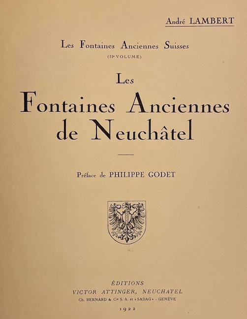 LAMBERT (André) Les fontaines anciennes de Neuchâtel. Neuchâtel, Victor Attinger (coll. Les Fontaines Anciennes Suisses – 2e volume), 1922.