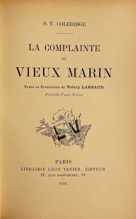 [LARBAUD] – COLERIDGE (Samuel Taylor) La complaine du vieux marin. Texte et traduction de Valery Larbaud. Précédé d’une notice. Paris, Léon Vanier, 1901.