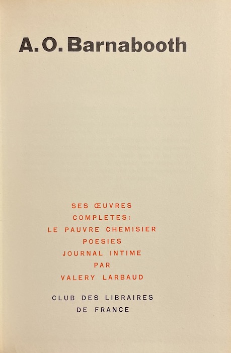LARBAUD (Valery) A. O. Barnabooth, ses oeuvres complètes. Paris, Club des Libraires de France, 1957.