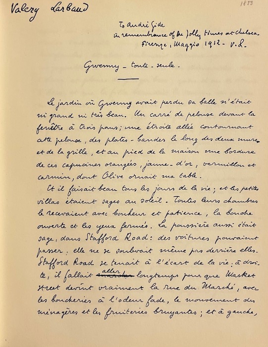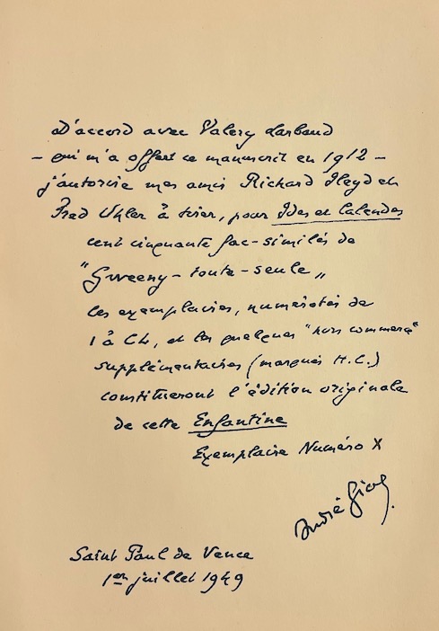 Edition originale numérotée 1/150 exemplaires (seul tirage mis à part quelques exemplaires hors commerce). Fac-similé du manuscrit autographe qui a été offert par Larbaud à André Gide en 1912. Le texte resté inédit jusqu’à ce jour fut confié à l’éditeur neuchâtelois pour ce tirage unique par Gide avec l’accord de l’auteur. Peu courant.