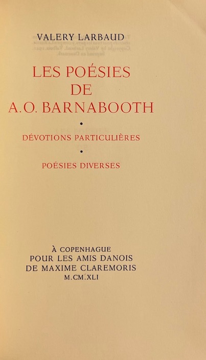 LARBAUD (Valery) Les Poésies de A. O. Barnabooth. Dévotions particulières. Poèsies diverses. A Copenhague, pour les amis danois de Maxime Claremoris, 1941. [i. e. The Hague, A.A,M, Stols, 1944].
