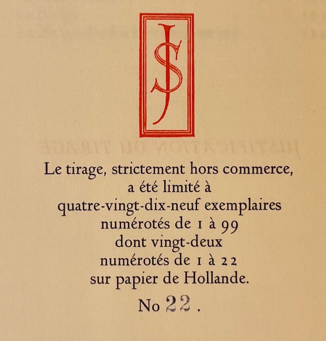 Edition hors commerce tirée à 99 exemplaires. celui-ci un des 22 exemplaires de tête numérotés sur papier de Hollande. Impression soignée en rouge et noir. Ouvrage publié clandestinement à l’occasion du soixantième anniversaire de Valery Larbaud. En parfaite condition.