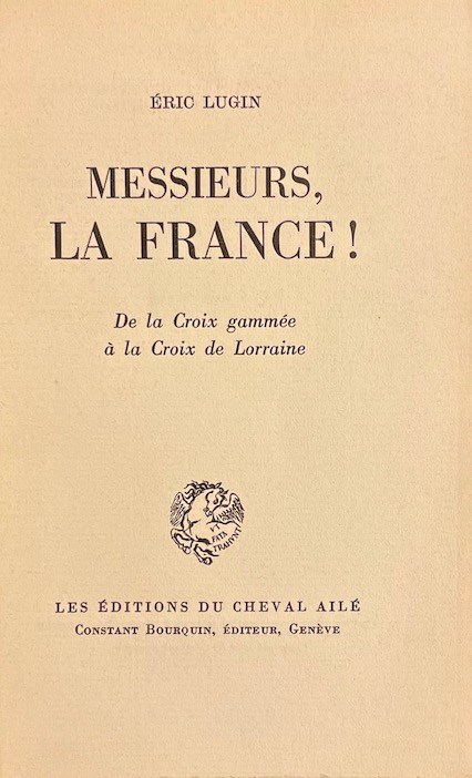 LUGIN (Eric) Messieurs, la France! De la Croix gammée à la Croix de Lorraine. Genève, A l’Enseigne du Cheval Ailé, 1944.