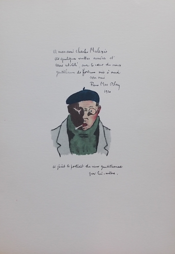 Un des 150 exemplaires numérotés sur vélin à la cuve comprenant en hors texte un autoportrait de Mac Orlan. Contient: une chanson inédite (Les compagnons du Tour de France), des hommages de G. Simenon, A. Salmon, etc… Illustrations de G. Bofa, Dignimont, Chas Laborde, Daragnés, et un portrait photographique de Mac Orlan. En parfaite condition.