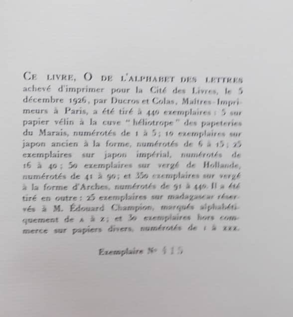 | Lieu d'éd. - Editions - Achevé d'imprime | Paris, A la Cité des Livres (coll. L'Alphabet des Lettres), 1926. |
