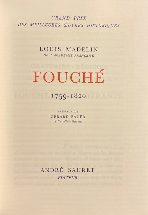 MADELIN (Louis) Fouché (1759-1820). Paris, Sauret (coll. Grand Prix des Meilleures Oeuvres Historiques), 1967.