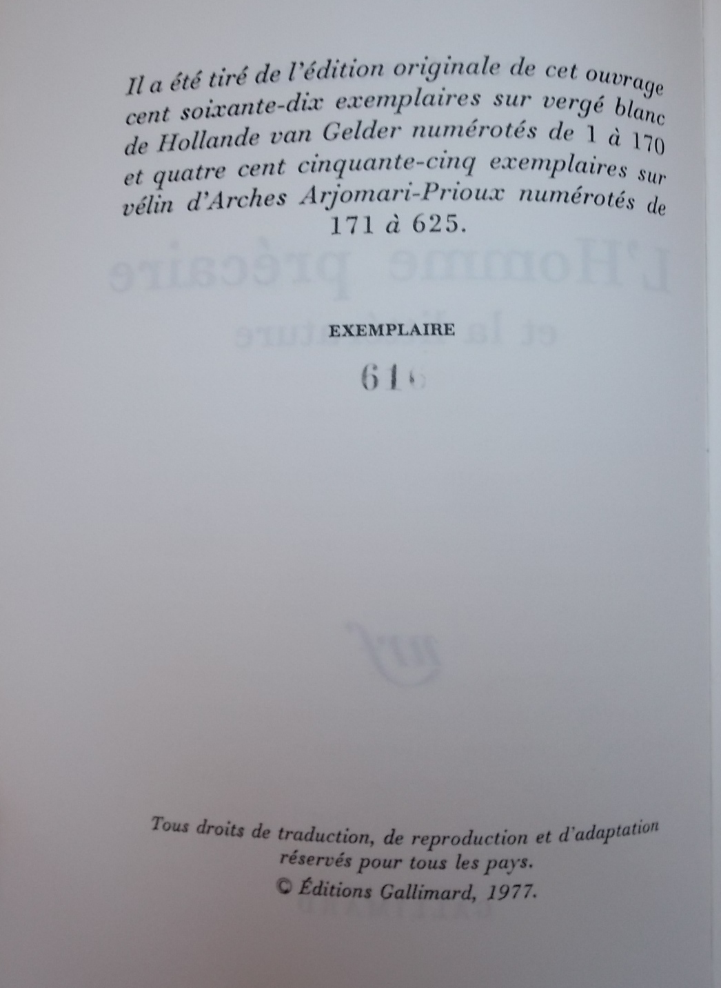 MALRAUX (André) L’homme précaire et la littérature. Paris, Gallimard (coll. Blanche), 1977.