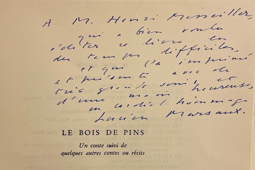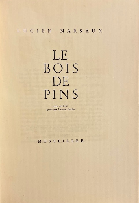 MARSAUX (Lucien) [pseud. d’André Hofer] Le bois des pins. Neuchâtel, Messeiller, 1950.