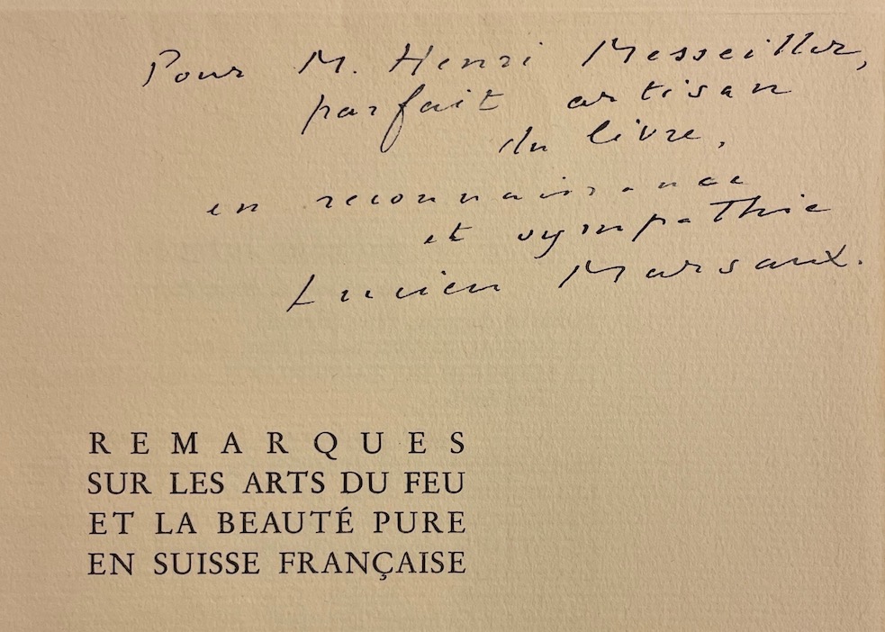 ![MARSAUX (Lucien) [pseud. d'André Hofer] Remarques sur les arts du feu et la beauté pure en Suisse française. Neuchâtel, Messeiller,1949. – Image 3](https://cabinetamateur.ch/wp-content/uploads/2025/11/40508_3.jpg)