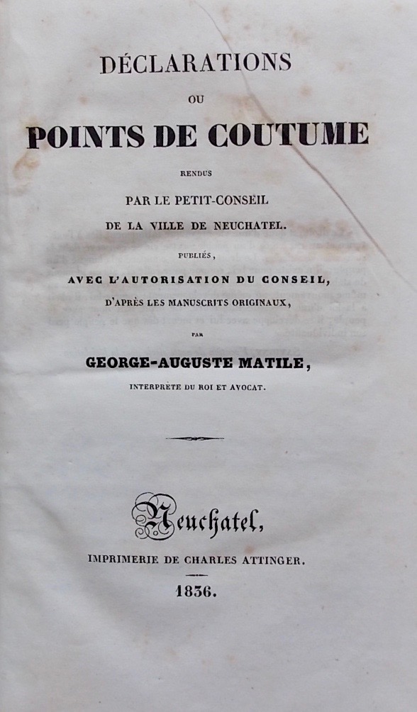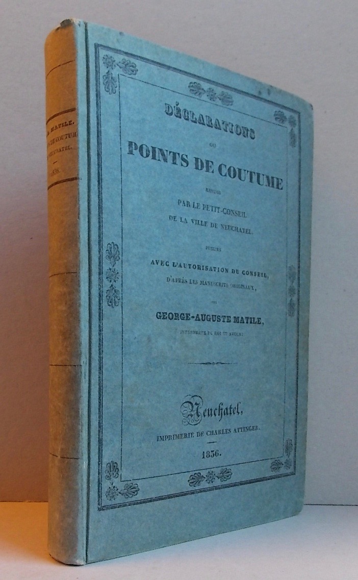 MATILE (Georges Auguste) Déclarations ou points de coutume rendus par le Petit-Conseil de la Ville de Neuchâtel. Neuchâtel, Imprimerie de Charles Attinger, 1836.