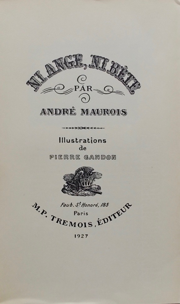 MAUROIS (André) Ni ange, ni bête. Paris, Trémois, 1927.