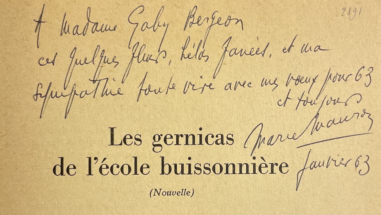 MAURON (Marie) Les gernicas de l’école buissonnière. Bruxelles, Ad. Goemaere, 1962.