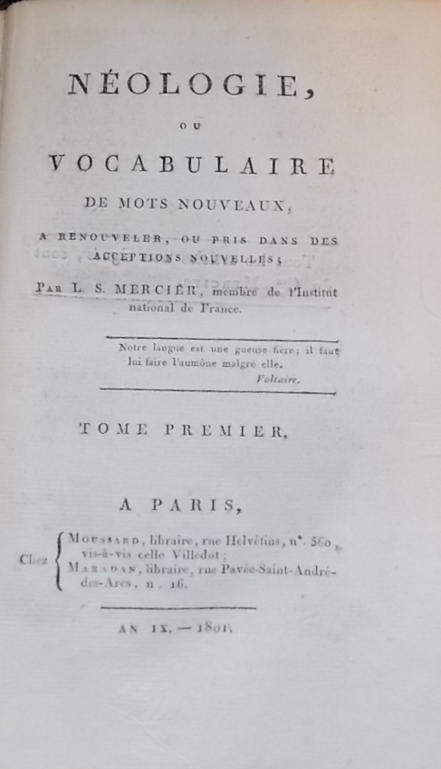 MERCIER (Louis-Sébastien) Néologie, ou vocabulaire de mots nouveaux. Paris, Moussard et Maradan, an IX – 1801.