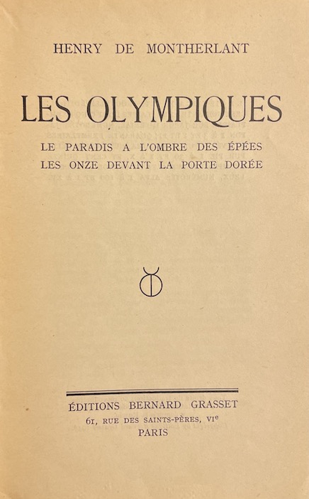 MONTHERLANT (Henry de) Les Olympiques. Le paradis à l’ombre des épées. – Les onze devant la porte dorée. Paris, Grasset, 1938.